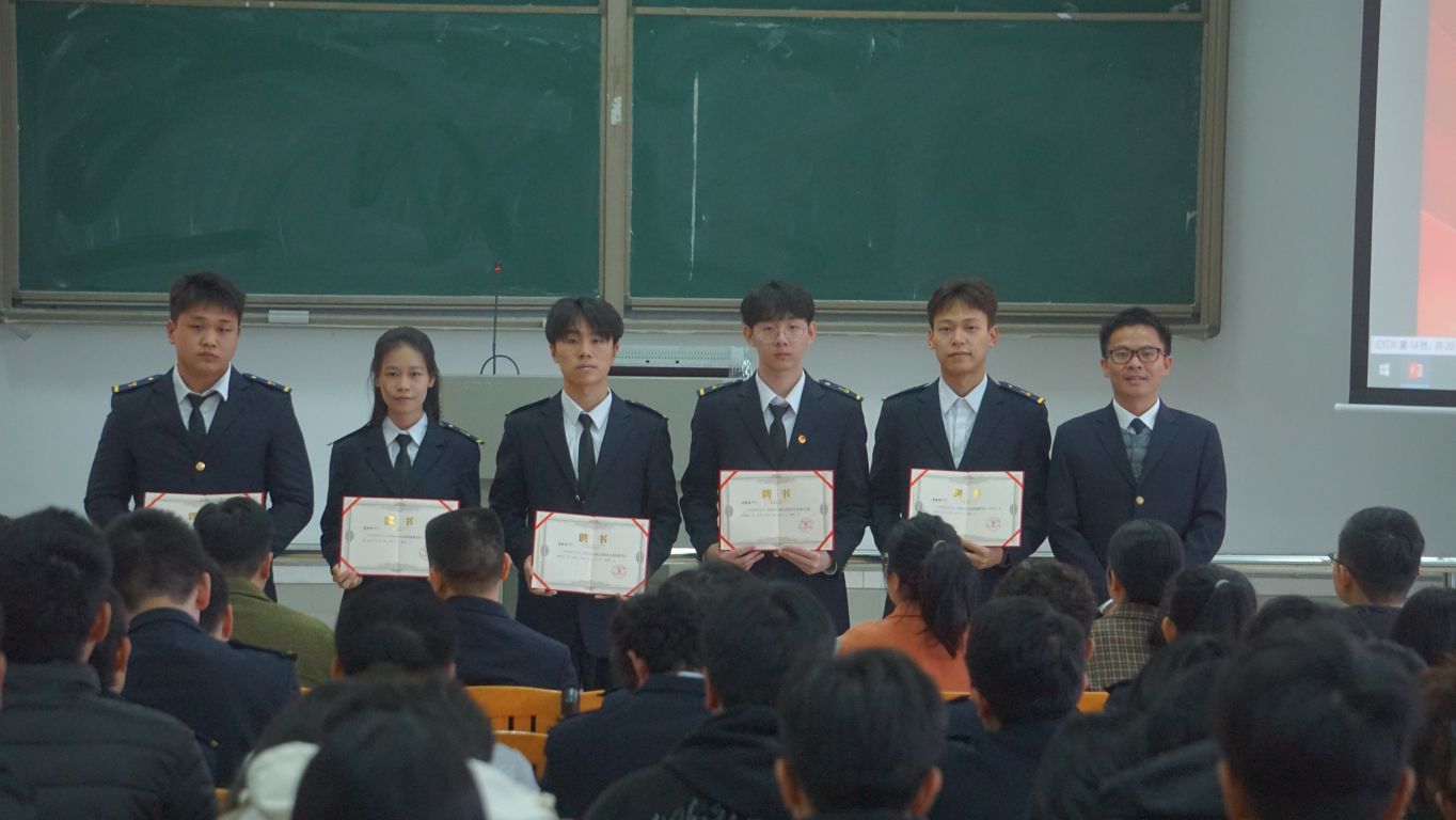 学生代表团的决定,杨璟、李良两位老师为校运会获奖代表颁奖。钟聪仕老师、陈岸斌老师分别为分团委学生会新一届学生干部颁发聘书。