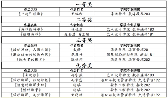 自4月26日大赛启动以来,创新创业学院与海运学院积极组织,大赛共征集到来自全校同学78份作品,参赛作品类型共三类,A类是平面设计类,B类是数字媒体类,C类是海洋文化设计手绘作品类。6月10日,海运学院邀请祝鸿高级船长、李德鑫高级船长、陈昌明高级船长、黄橙老师、秦志勇老师等五位专业教师对参赛作品进行评选,通过层层筛选和评委老师的评审,最终评选出32份获奖作品及3个优秀组织奖。本次大赛的获奖作品将进行公开展示,A类与C类作品展示于航海楼一楼展示厅,所有获奖作品(含B类)后续将在海运团学公众号进行展示。