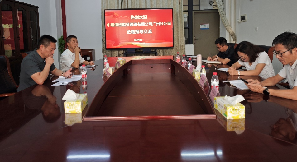 ,学院党委书记周楠等热情接待了汪家元一行。双方在B7航海楼514会议室围绕2025年“中远海运新型船员培养班”、2026届毕业生就业工作等深化校企合作相关事宜进行协商交流。