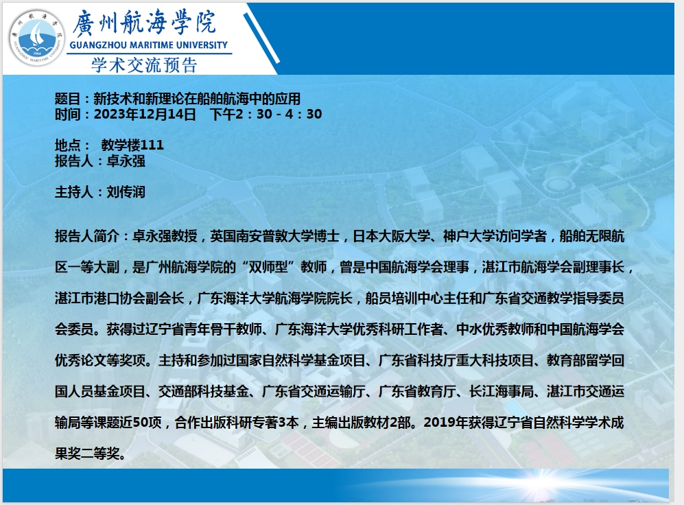 卓永强教授学术学术交流预告:新技术和新理论在船舶航海中的应用