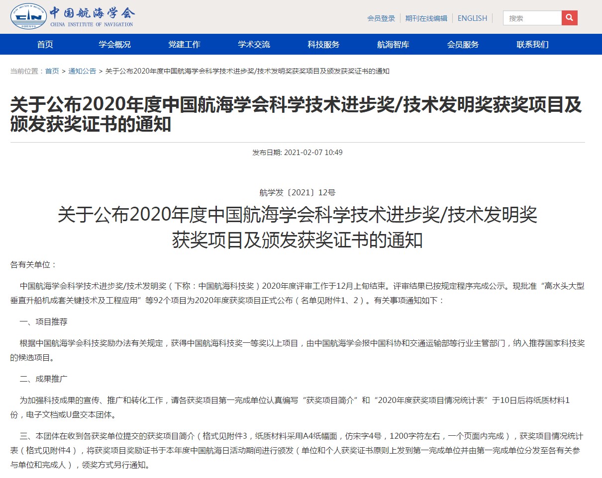 作为第一申报单位,与广东海事局、港珠澳大桥管理局联合申报的项目《珠江口水上交通安全治理方法与技术研究与应用》荣获“中国航海学会科学技术进步一等奖”。