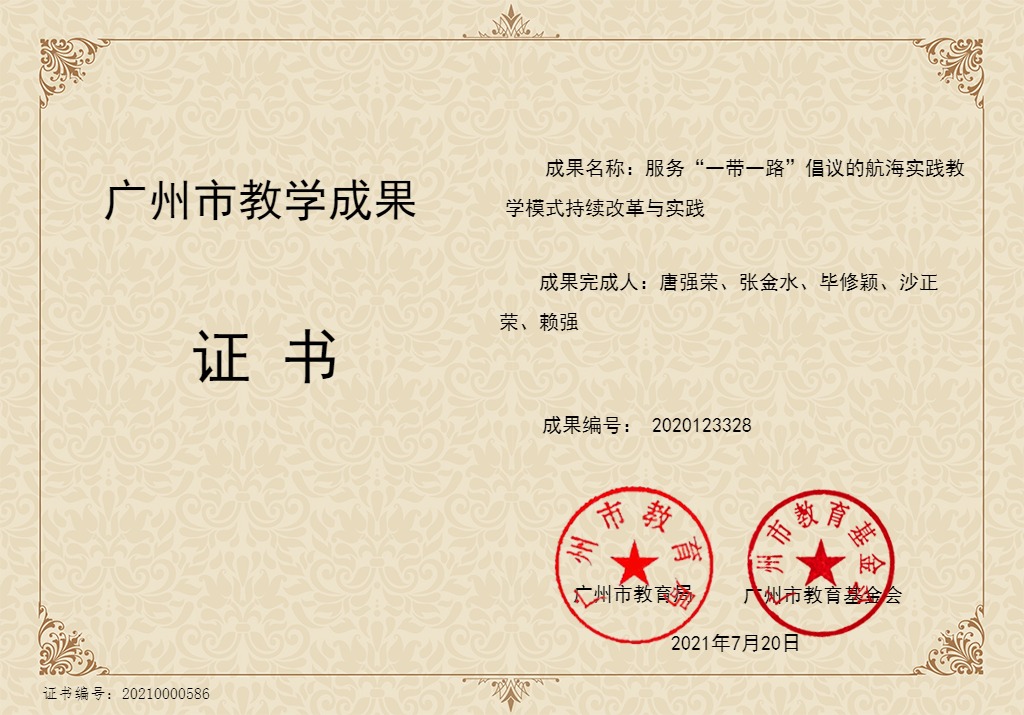 (海运学院供稿)由副校长兼海运学院院长唐强荣教授、副校长毕修颖教授、海运学院沙正荣教授、张金水老师、赖强老师组成的科研团队的研究成果《服务“一带一路”倡议的航海实践教学模式持续改革与实践》荣获“广州市教学成果”奖。