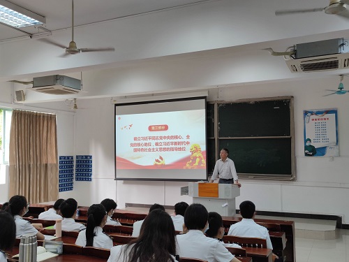 课上,施书记以同学们高考赶考为切入点,从中国共产党建党百年取得的伟大成就和党团结带领中国人民又踏上了实现第二个百年奋斗目标新的赶考之路,生动地宣讲党的十九届六中全会精神。通过“中国共产党党史中的三个历史决议”、“《中共中央关于党的百年奋斗重大成就和历史经验的决议》的主要内容”、“党确立习近平同志党中央的核心、全党的核心地位,确立习近平新时代中国特色社会主义思想的指导地位”三个部分解读了党的十九届六中全会思想的精华,让同学们了解了中国共产党始终坚守初心的百年奋斗史和不断飞跃的百年发展史。施书记通过分享自己的亲身经历给同学们,使同学们感受到中国共产党做出的正确决策,使大家拥有了现在和平稳定、幸福美好的生活,感受到了祖国强大的魅力。