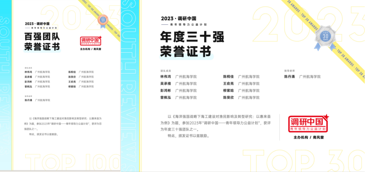 由海运学院学子组成的长风举棹调研团,在陈丹涌副教授的带领下,以作品《海洋强国战略下海工建设对渔民影响及转型研究:以惠来县为例》在年度百强队伍中脱颖而出,入选“2023调研中国年度十强队伍”,成为性吧