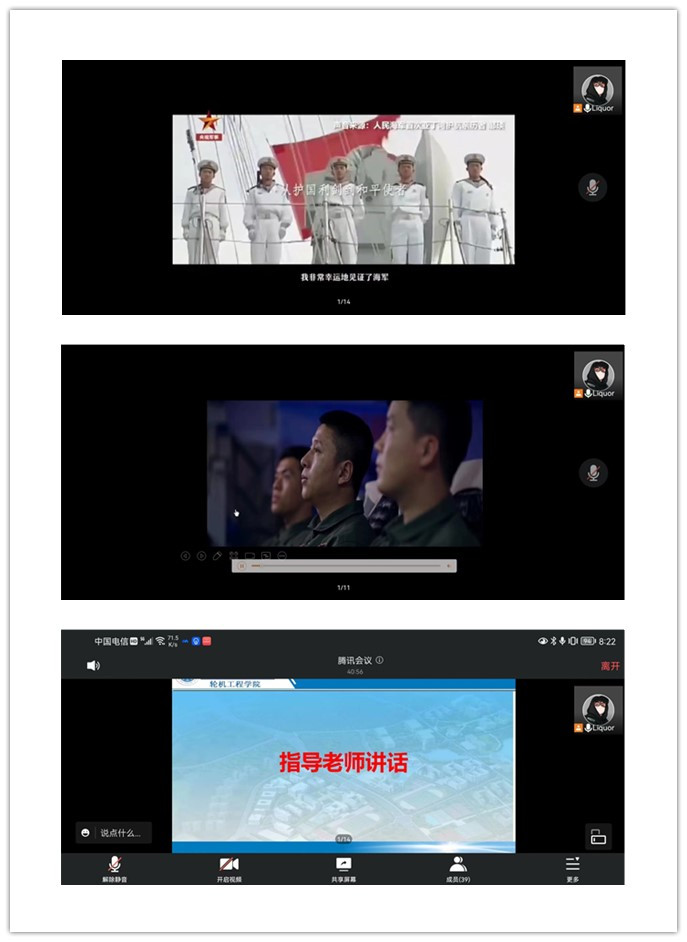 活动伊始,大家一起观看了中国军号、海政宣传局联合发布首部航母主题宣传片《深蓝!深蓝!》,感受党的十八大以来海军部队转型建设取得的巨大成就,感悟广大海军官兵勇毅前行、奋斗强军的风采风貌。随后,退役大学生代表轮机211班邹运来同学分享了他的海军经历以及生活感悟。他说,我们国家海军建设发展迅速,我有幸能加入海军是我一生的骄傲,海军经历是我终身的宝贵财富和美好记忆。他呼吁广大同学关注关心海防、国防建设。最后,赵垒老师带领大家观看了《人民海军,生日快乐》、《辽宁舰与山东舰究竟有啥区别》两个军事纪实片,并给大家讲解了中国人民解放军海军的基本情况、历史发展、海军编队等相关国防知识,并再次强调了航海类专业的国防性,号召轮机学子将个人的理想抱负与家国情怀结合起来,在新时代新征程中奋力实现自我价值与社会价值的有机统一。