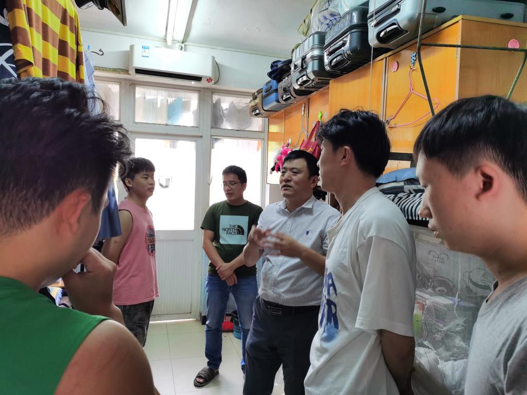 走访过程中,滕院长对所在宿舍的同学们致以节日的问候,查看了同学们的宿舍卫生、通风条件、内务整理等情况。同时叮嘱同学们假期仍要规律作息,要做好个人防护,不聚集,搞好个人内务和卫生,要注意宿舍通风。在新生年级宿舍中,滕院长耐心询问同学们大学生活适应情况,鼓励他们要积极进取,珍惜大学时光,不负韶华;在毕业年级宿舍中,滕院长与同学们亲切交流就业形势、学业计划,了解同学们的就业签约情况,鼓励同学们要积极备考大证、积极就业。