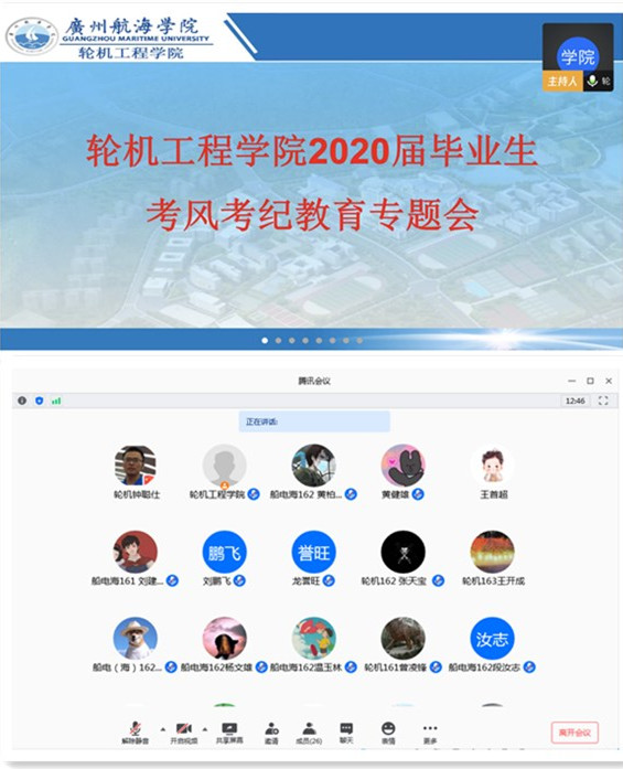 (轮机工程学院供稿)为了更好地端正考风、严肃考纪,营造文明、诚信考试的良好氛围,确保返校毕业生严格按照疫情防控要求参加考试,轮机工程学院2020届毕业生考风考纪教育专题会于 6月18日通过腾讯会议召开,学院毕业生辅导员钟聪仕和全体考试的学生参会。