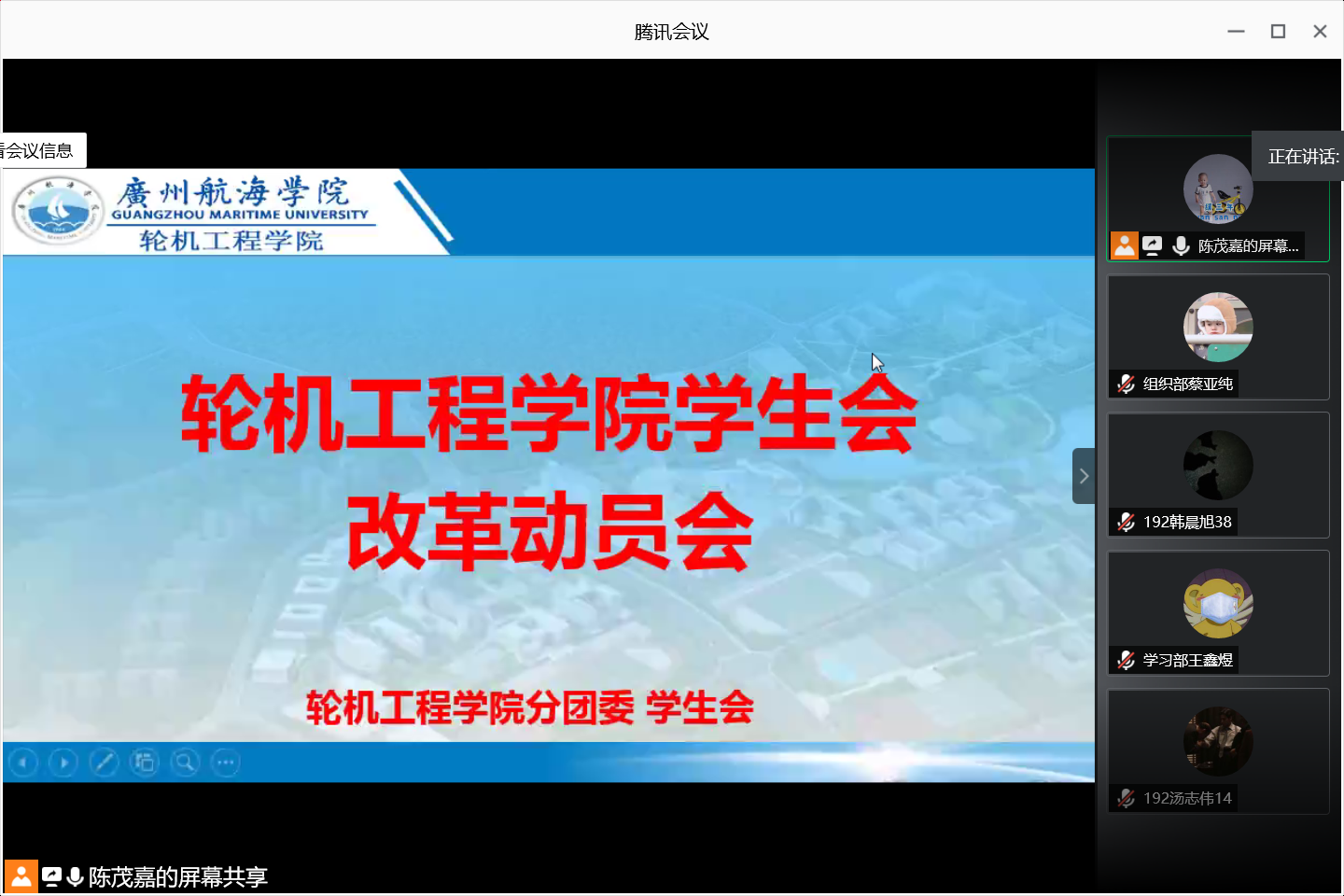 二级学院学生会改革指引》要求, 6月16日,轮机工程学院分团委、学生会通过腾讯会议平台召开了学生会改革动员会,会议由学院分团委书记陈茂嘉老师主持,全体分团委、学生会干部参加了会议。
