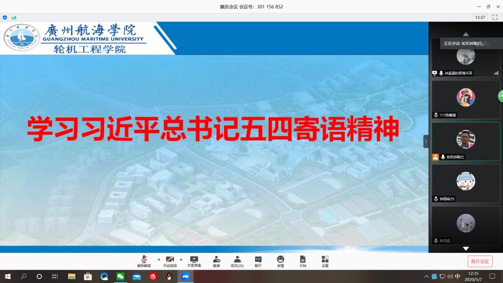 (轮机工程学院供稿)5月5日-7日,轮机工程学院第一、第二学生党支部和分团委分别在学生第一党支部书记郭世俊老师、学生第二党支部书记钟聪仕老师和分团委书记陈茂嘉老师的带领下,通过腾讯会议平台学习了习近平总书记五四寄语精神。