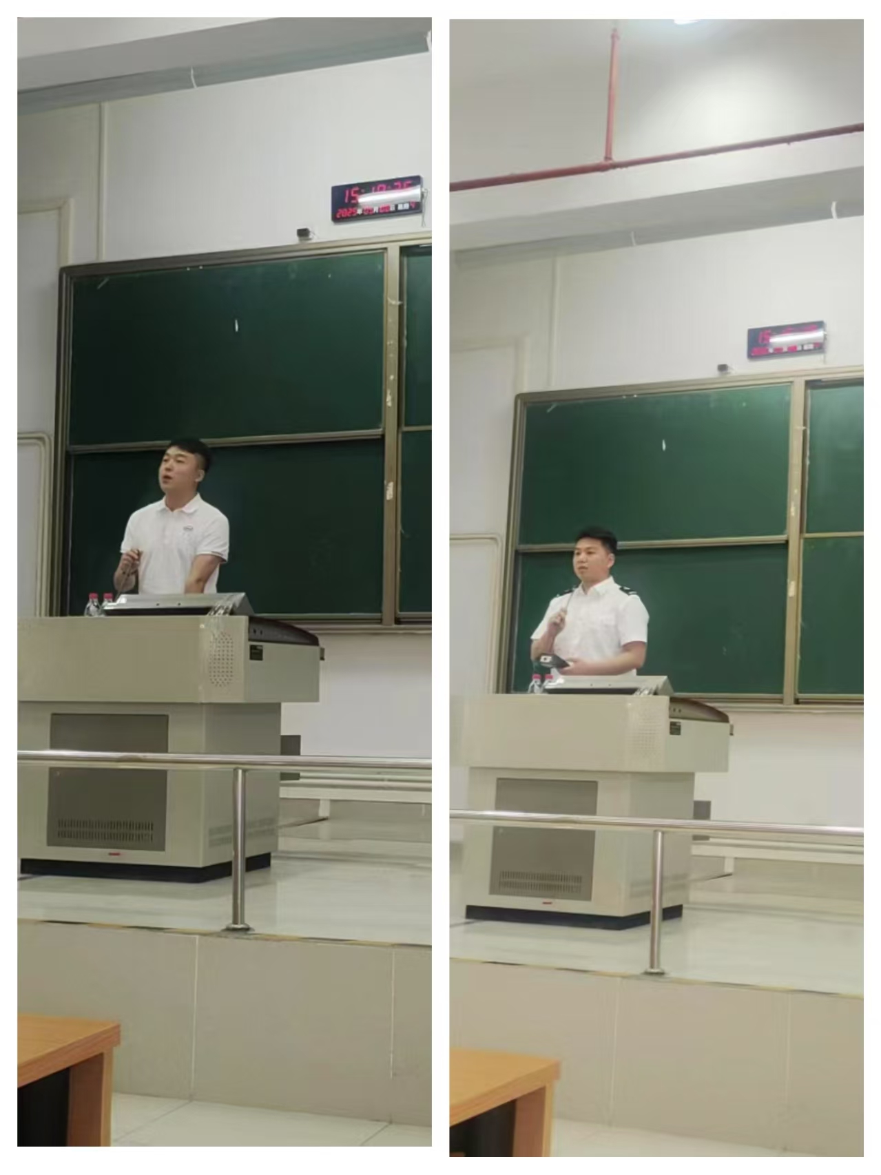 会上,2024届航海技术专业的校友顿建强和郭智翱以中远海运船员管理有限公司“海上管培生”身份,向师弟师妹们分享了在公司工作期间的心得体会。他们分别讲述了各自入职公司的面试过程和海上工作体验,激励师弟师妹们要珍惜学习机会,不断提高理论和实践相结合的能力,不断提升自身能力素质,脚踏实地,砥砺前行,立志远洋事业,实现航海梦。