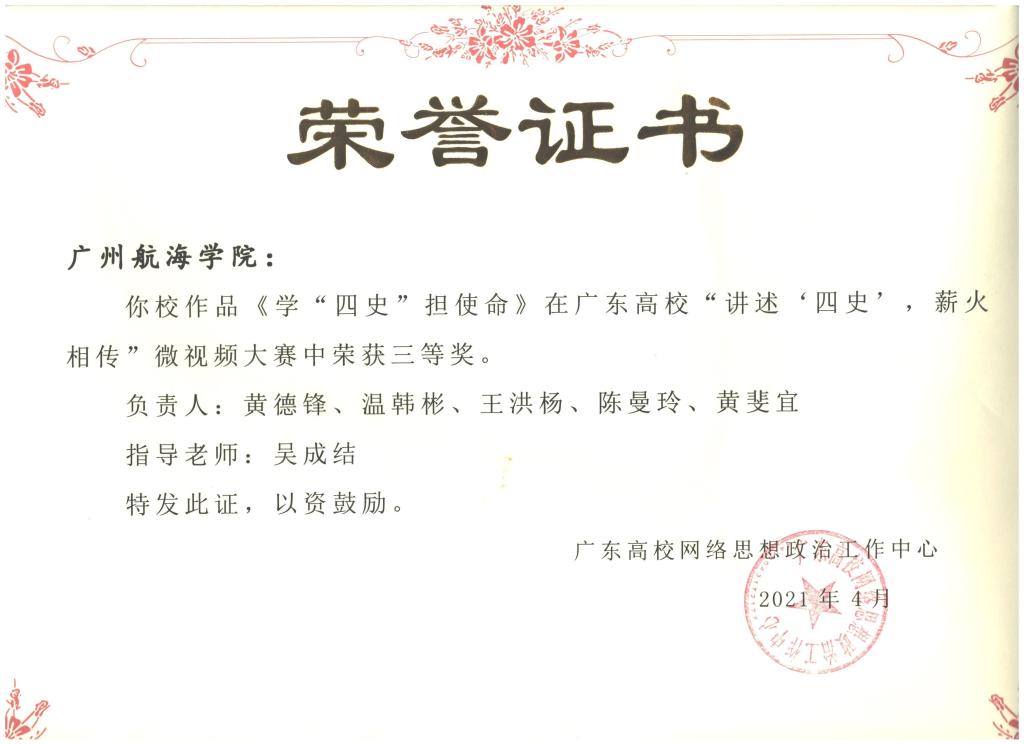 近日,广东高校网络思想政治工作中心公布“讲述‘四史’,薪火相传”微视频大赛获奖名单并下发了获奖证书,我院吴成结老师指导的,黄德锋等同学申报的作品《学“四史” 担使命》又喜获三等奖。