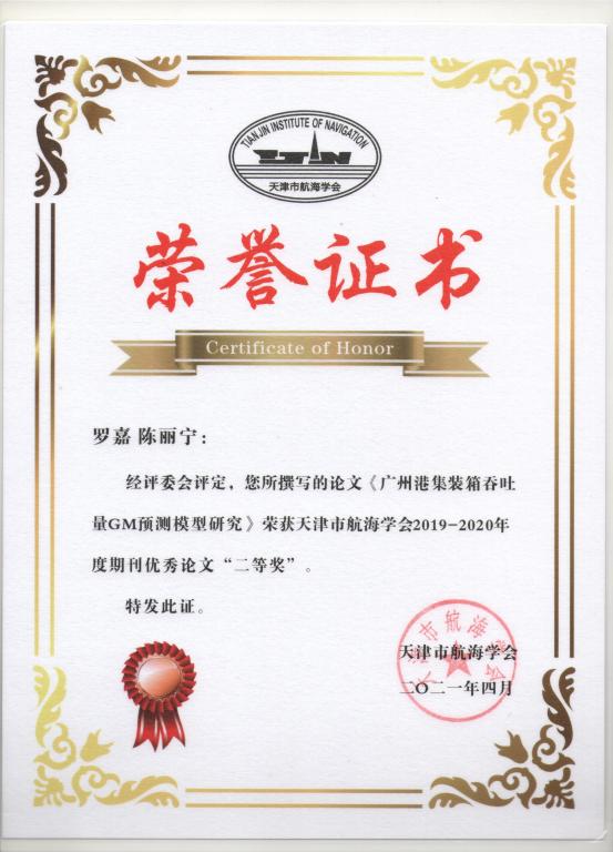 (海运学院供稿)2021年4月,我院海事管理专业17级学生罗嘉、海运学院教师陈丽宁共同完成的论文《广州港集装箱吞吐量GM预测模型研究》喜获天津市航海学会2019-2020年度期刊优秀论文二等奖。