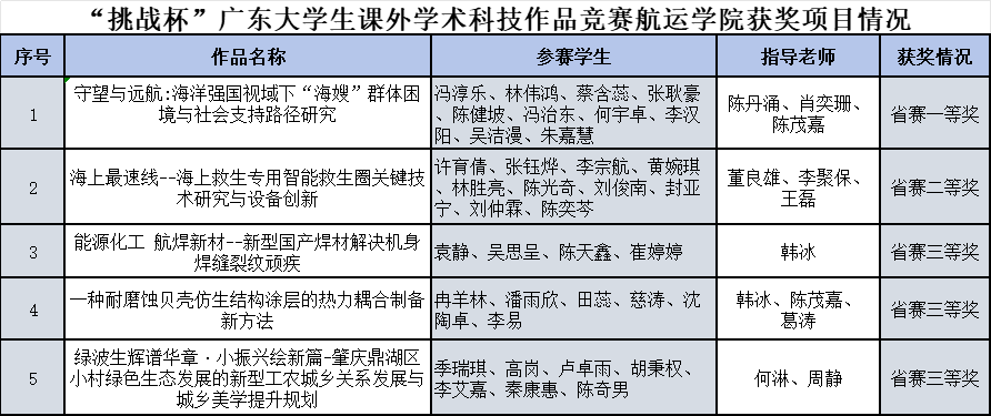 本次“挑战杯”竞赛中,性吧 师生紧扣专业特色需求,围绕行业群体人文关怀与海洋科技发明提交多项高水平作品。哲学社会科学类调查报告《守望与远航:海洋强国视域下“海嫂”群体困境与社会支持路径研究》获省赛一等奖,是学校在该项目获得首个省赛一等奖,实现历史性突破。项目团队通过实地调研与深度访谈“海嫂”群体,关注大国担当背后的“小众群体”。科技发明类项目《海上最速线——海上救生专用智能救生圈关键技术研究与设备创新》获二等奖,其智能化设计显著提升海上救援效率;三等奖项目《航焊新材——新型国产焊材解决机身焊缝裂纹顽疾》《一种耐腐蚀贝壳仿生结构涂层的热力耦合制备新方法》分别攻克船舶材料技术难题,助力海洋强国建设。“挑战杯”肇庆专项赛省赛三等奖项目《绿波生辉谱华章·小振兴绘新篇-肇庆鼎湖区小村绿色生态发展的新型工农城乡关系发展与城乡美学提升规划》则以肇庆新农村为实例,探索生态振兴新路径,彰显学科交叉创新优势。