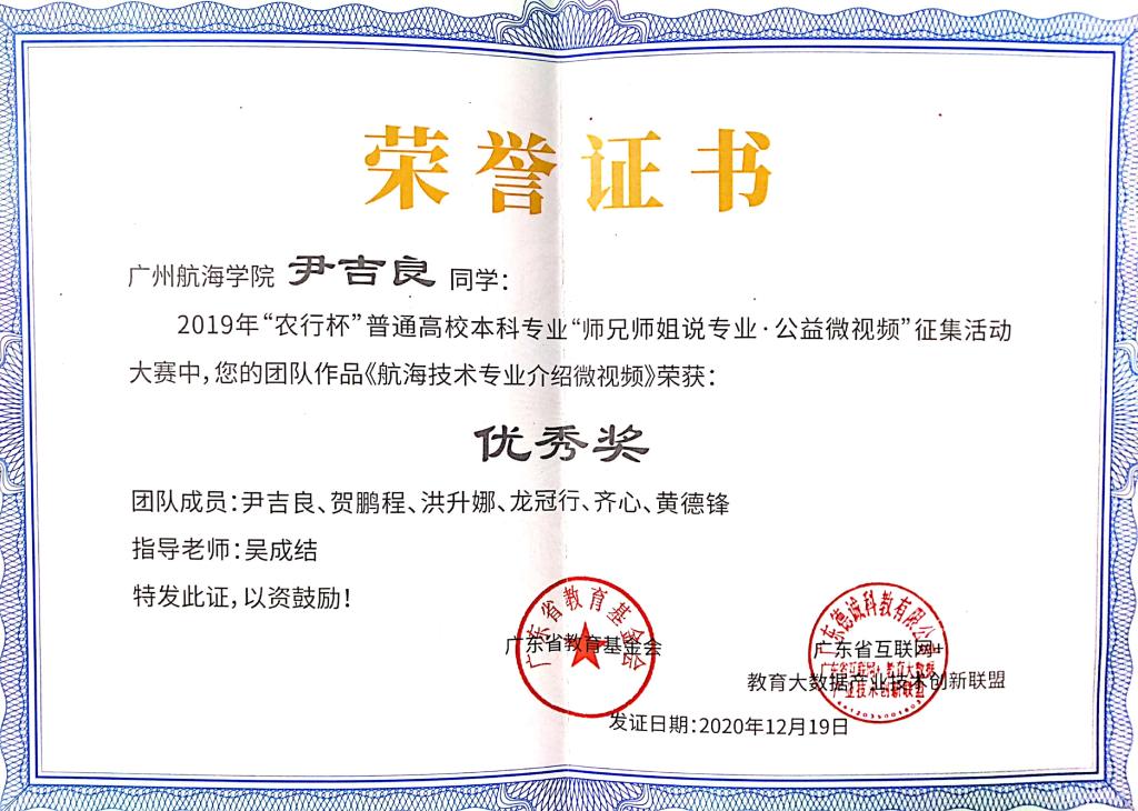 尹吉良团队-获2019年“农行杯”普通高校本科专业“师兄师姐说专业.公益微视频”作品《航海技术专业介绍微视频》优秀奖