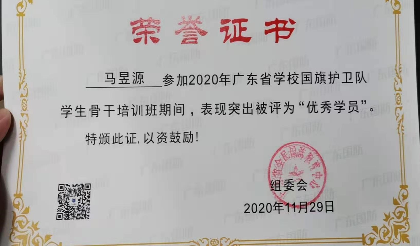 马昱源同学-2020年广东省学校国旗护卫队“优秀学员”